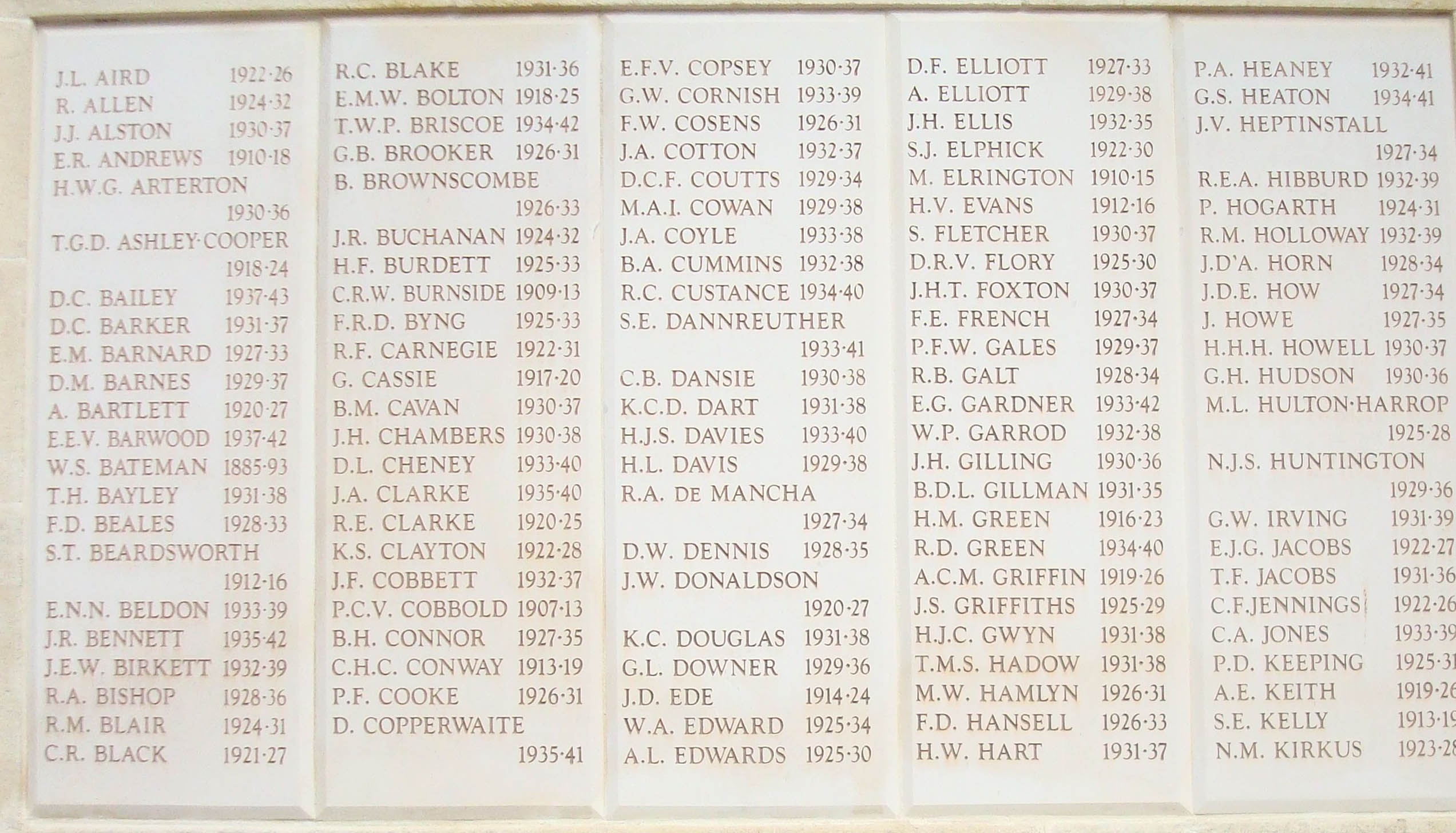 Inscription details Inscription ID:263 Brief Description:WW2 Roll of Honour board at Christs Hospital School, near Horsham, Surrey Type:Honour Roll Detail:Two images of the WW2 War Memorials at Christs Hospital school. The dates against the names are the dates during which the individual attended the school; this would probably be from age 9 to 11, up to 15 or 19 years depending on their academic ability. The names can be read if the image is sufficiently enlarged. Inscription: Place:Christs Hospital School, Horsham County:Surrey Country:England Date:1939-1945 Contributor:Terry Silcock Photo(s):ChristsHospHorsham_WW2a.jpgChristsHospHorsham_WW2b.jpg Names:View all names on inscription Do another search