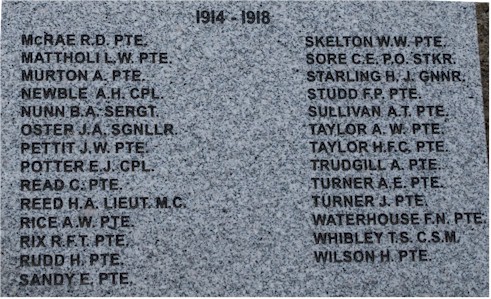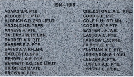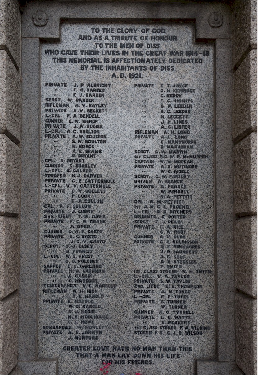 Inscription details Inscription ID:318 Brief Description:War Memorial at Diss, Norfolk. Type:War Memorial Detail:The Memorial is situated outside the Church of St Mary the Virgin, Diss, Norfolk. It has four panels, the main one and three additional panels at its foot. The main panel is for WW1, as are the right and left lower panels; the centre one is for WW2 names. Inscription:To the glory of God and as a tribute of honour to the men of Diss who gave their lives in the Great War 1914-18 this memorial is affectionately dedicated by the inhabitants of Diss AD 1921. Place:Doss County:Norfolk Country:England Date:1914-1918 Contributor:Peter Hagger Photo(s):DissWarMemorial_WW1_main.jpgDissWarMemorial_WW1_lowerleft.jpgDissWarMemorial_WW1_lowerright.jpgDissWarMemorial_WW2_lowercentre.jpg Names:View all names on inscription Do another search