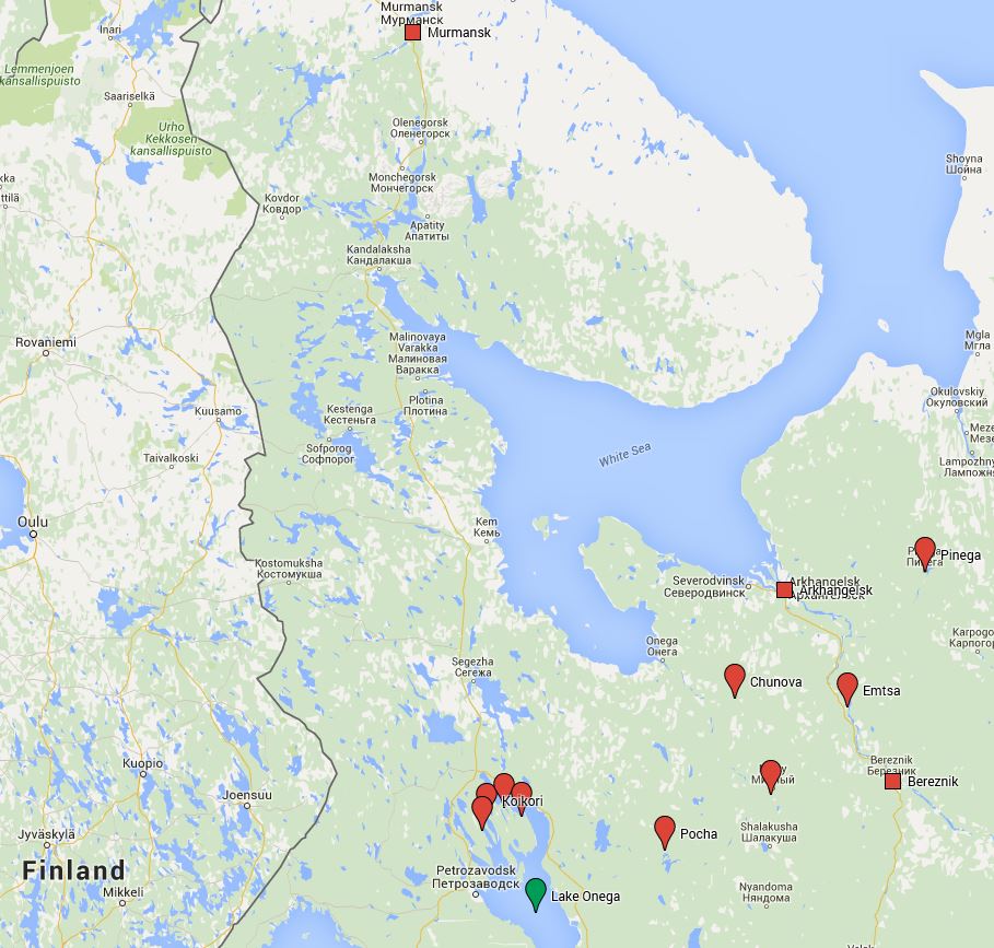 A map showing those locations bombed with M gas bombs has been compiled. The airline distance from Murmansk to the Shunga Peninsula in Lake Onega is 700 km. This seems an unlikely distance for a WWI aircraft – 1,400 km return flight? Bereznik was 800 km return from Shunga, and only 480 km to Pocha for example. Archangel to Pinega was only 300 km return.
